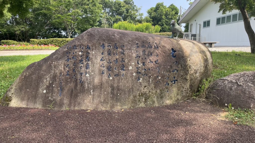 上り線では「里山」を、下り線では「鎮守の森」をイメージしてリフレッシュされた庭園には、雨情の代表的な童謡の歌詞が刻まれた詩碑が点在しています。特に上り線では7基、下り線では6基の詩碑が設置されており、大きな花崗岩などに彫られた文字は、風景と一体となって旅人を迎えます。