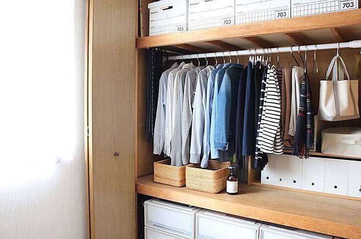 ・この掃除のタイミングで、クローゼットの奥や上段といったデッドスペースを改めて確認し、突っ張り棒や吊り下げ収納などの収納グッズの追加や配置変更の検討を行いましょう。特に上段の棚には、取っ手付きのボックスを使うと、出し入れが容易になります。