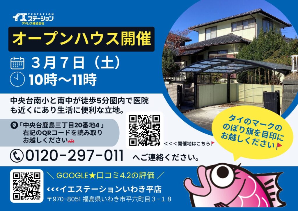 【いわき市中央台】完全予約制★3月7日オープンハウス開催のお知らせ|不動産の売買ならイエステーションアドレス株式会社 最終更新日:2026.2.25 物件詳細は画像をクリックしてご確認ください。 ▶内覧予約はこちら