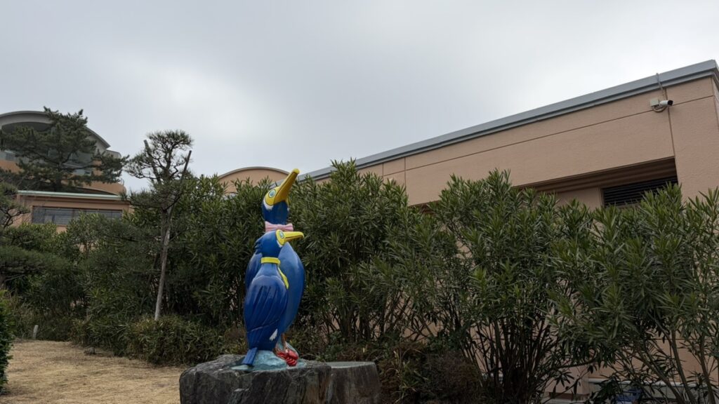 敷地内に設置された、ウミウをモチーフにした色鮮やかなモニュメント。