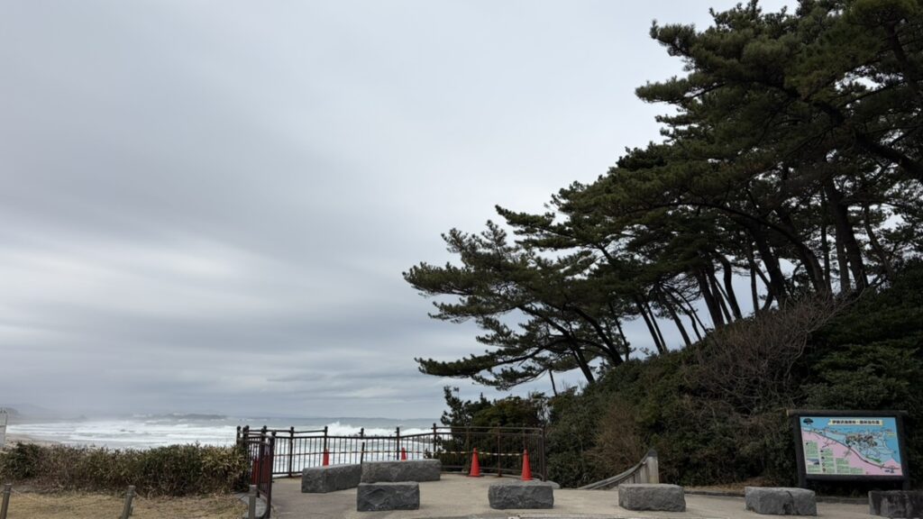 海沿いの防風林として植えられた松の木越しに、広大な海を望む。ベンチも設置され、ゆったりとした時間を過ごせる設計です。