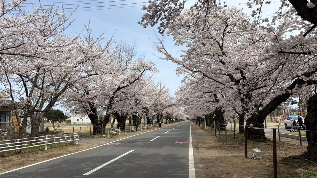 満開のピークを迎えた4月4日。時折吹き抜ける風が、まだ瑞々しい花びらを揺らし、ハラハラと舞い上がらせます。視界を遮るもののない、まっすぐな道をどこまでも歩いていく。その心地よさは、この場所でしか味わえない贅沢なひとときです。