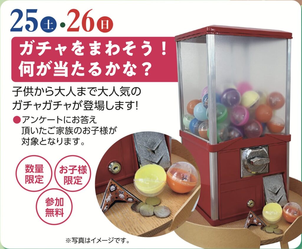 同じく25日、26日に開催されます。ぜひご家族でアンケートにご協力いただき、お子様に楽しいガチャ体験をさせてあげてください。