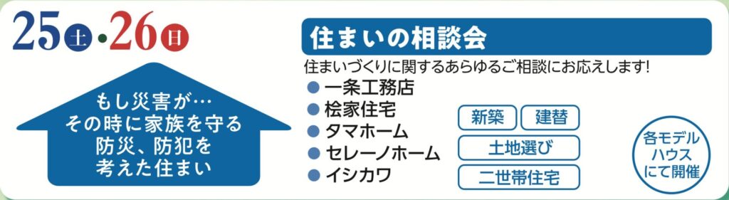 住宅は、家族の生活を守るシェルターとしての役割も担います。近年、多発する自然災害や防犯意識の高まりを受け、今回のフェアでは「もし災害が…その時に家族を守る防災、防犯を考えた住まい」をテーマとした「住まいの大相談会」です 。