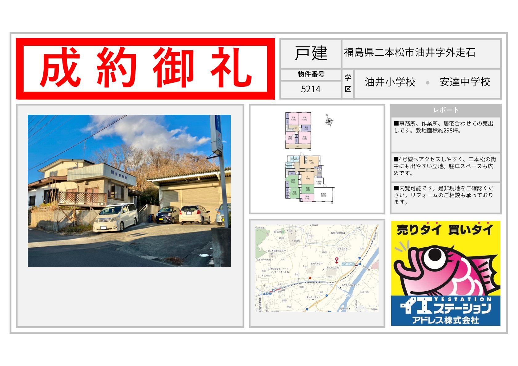 売買実績 | 不動産の売買ならイエステーションアドレス株式会社 エリアを選択 福島県 (1,159) いわき市 (606) 郡山市 (70) 田村市 (17) 田村郡 (27) 福島市 (53) 伊達市 (42) 伊達郡 (24) 二本松市 (48) 南相馬市 (55) 相馬市 (44) 会津若松市 (50) 喜多方市 (61) 耶麻郡 (18) 河沼郡 (14) 大沼郡 (6) 双葉郡 (4) 南会津郡 (1) 本宮市 (5) 相馬郡 (1) 須賀川市 (1) 宮城県 (742) 仙台市 (100) 名取市 (40) 岩沼市 (55) 白石市 (71) 角田市 (79) 柴田郡 (97) 亘理郡 (101) 伊具郡 (28) 塩竈市 (65) 宮城郡 (34) 東松島市 (10) 大崎市 (2) 富谷市 (3) 多賀城市 (7) 刈田郡 (11) 登米市 (1) 石巻市 (28) 遠田郡 (5) 気仙沼市 (1) 黒川郡 (1) 牡鹿郡 (1) 加美郡 (1) 茨城県 (221) 日立市 (76) 北茨城市 (44) 高萩市 (18) 那珂市 (17) ひたちなか市 (15) 常陸太田市 (32) 那珂郡 (4) 東茨城郡 (6) 常陸大宮市 (6) 山形県 (1) 山形市 (1) 2026年02月06日 福島県伊達郡国見町大字藤田字中沢一 2026年02月06日 福島県相馬市小泉字高池 2026年02月06日 福島県福島市町庭坂字中通 2026年02月06日 福島県福島市瀬上町字柳沼 2026年02月06日 茨城県北茨城市磯原町磯原 2026年02月06日 宮城県仙台市青葉区水の森二丁目 2026年02月06日 宮城県東松島市矢本字関の内 2026年02月06日 福島県いわき市平中山字矢ノ倉 2026年02月06日 宮城県仙台市太白区中田二丁目 2026年02月06日 福島県二本松市油井字外走石 2026年02月06日 福島県いわき市平字六人町 2026年02月06日 福島県耶麻郡猪苗代町字鶴峰西 1 / 177123...» 福島県の成約事例宮城県の成約事例茨城県の成約事例山形県の成約事例