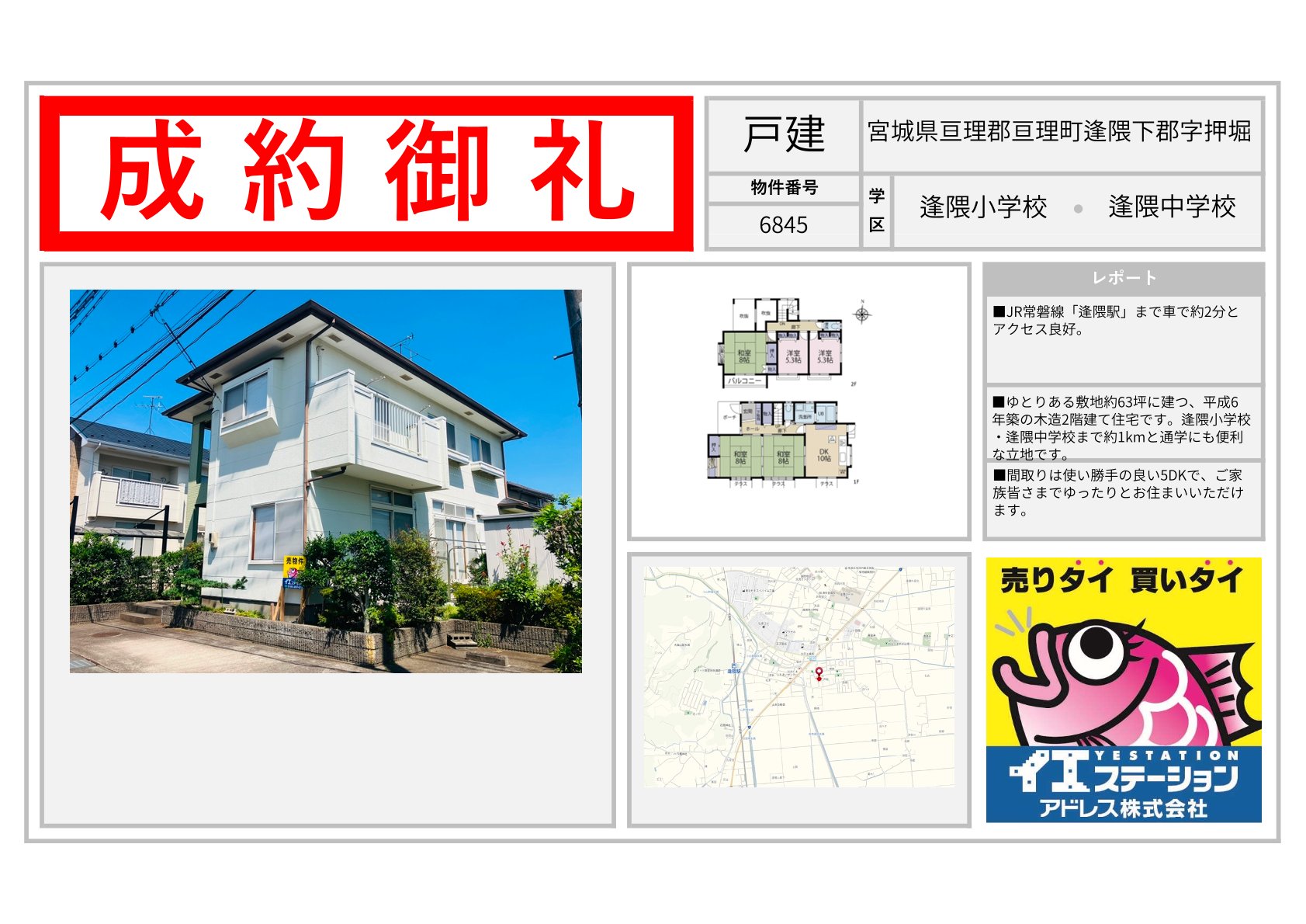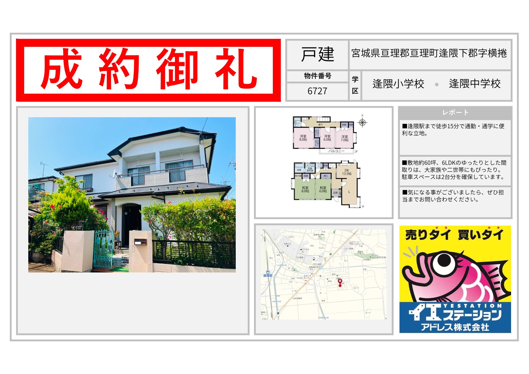 売買実績 | 不動産の売買ならイエステーションアドレス株式会社 エリアを選択 福島県 (1,098) いわき市 (577) 郡山市 (69) 田村市 (15) 田村郡 (27) 福島市 (48) 伊達市 (37) 伊達郡 (23) 二本松市 (44) 南相馬市 (52) 相馬市 (38) 会津若松市 (49) 喜多方市 (60) 耶麻郡 (17) 河沼郡 (14) 大沼郡 (5) 双葉郡 (4) 南会津郡 (1) 本宮市 (5) 相馬郡 (1) 宮城県 (703) 仙台市 (93) 名取市 (38) 岩沼市 (55) 白石市 (66) 角田市 (73) 柴田郡 (93) 亘理郡 (97) 伊具郡 (25) 塩竈市 (64) 宮城郡 (33) 東松島市 (9) 大崎市 (2) 富谷市 (3) 多賀城市 (7) 刈田郡 (11) 登米市 (1) 石巻市 (23) 遠田郡 (5) 気仙沼市 (1) 黒川郡 (1) 牡鹿郡 (1) 加美郡 (1) 茨城県 (201) 日立市 (68) 北茨城市 (38) 高萩市 (15) 那珂市 (16) ひたちなか市 (14) 常陸太田市 (31) 那珂郡 (4) 東茨城郡 (6) 常陸大宮市 (6) 山形県 (1) 山形市 (1) 2025年10月08日 福島県郡山市湖南町浜路字下大平 2025年10月08日 宮城県亘理郡亘理町逢隈下郡字横捲 2025年10月08日 福島県いわき市常磐上湯長谷町五反田 1号棟 2025年10月08日 福島県福島市町庭坂字一本杉 2025年10月08日 宮城県伊具郡丸森町舘矢間木沼字木沼町 2025年10月08日 宮城県伊具郡丸森町金山字坂町 2025年10月08日 福島県福島市飯坂町東湯野字南畑 2025年10月08日 宮城県仙台市太白区四郎丸字昭和北 2025年10月08日 宮城県亘理郡亘理町逢隈下郡字押堀 2025年10月08日 福島県本宮市本宮字兼谷平 2025年10月08日 宮城県柴田郡大河原町大谷字保科前 2025年10月08日 宮城県塩竈市みのが丘 4 / 167«...345...» 福島県の成約事例宮城県の成約事例茨城県の成約事例山形県の成約事例