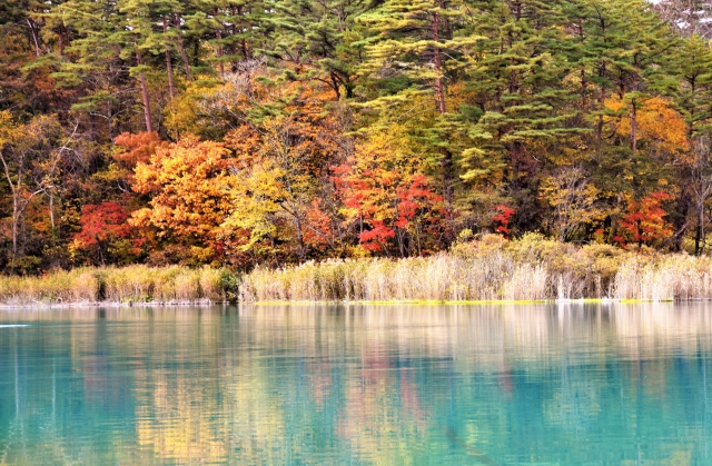 ・紅葉の特徴:カラマツ、モミジ、ナナカマドなどが色づきます。最大の特徴は、コバルトブルーの沼と、赤や黄色に染まった木々の鮮烈なコントラストです。探勝路は高低差が少なく整備されているため、初心者でもトレッキングを楽しみながら紅葉狩りができます(全長約3.6km、徒歩約1時間30分)。湖面に映り込む紅葉も絶景です。