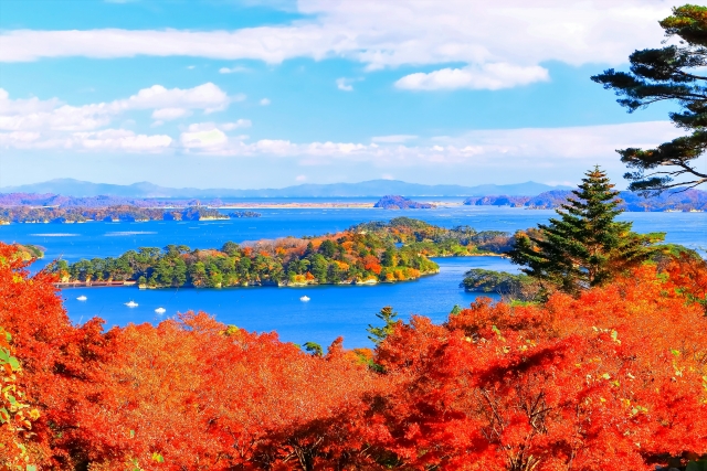 日本三景の一つに数えられる松島は、松島湾に浮かぶ約260の島々と、伊達家ゆかりの歴史的な寺社仏閣が調和した景勝地です。紅葉シーズンには、国の重要文化財である円通院や瑞巌寺といった古刹の庭園が赤や黄色に染まり、風光明媚な湾の景色に彩りを添えます。