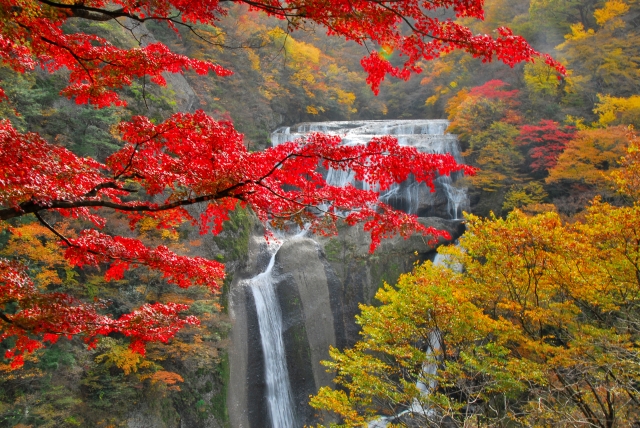 日本三名瀑の一つに数えられる雄大な滝と、それを囲む山々の紅葉が見事なコントラストを描きます。特に滝見台からの眺めは圧巻で、水しぶきと赤や黄色に染まった木々の競演は感動的です。
