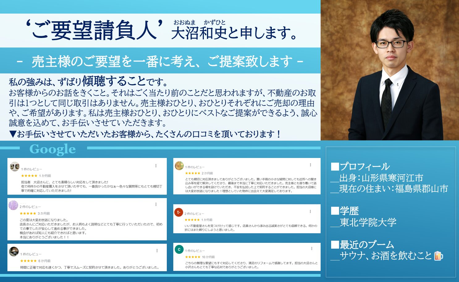 お客様の最終目的は不動産の売却や購入ではありますが、そこに行き着くまで、いかにスムーズなプロセスを踏めるかは私たちの力量にかかっております。そのため、お客様のご事情やご希望を細部まで汲み取り、お一人お一人に合った接客を日々心がけております。「大沼さんにお願いして良かった」と感じていただけるよう誠心誠意、努めさせていただきますので、気兼ねなくお店にお越しいただければと思います。